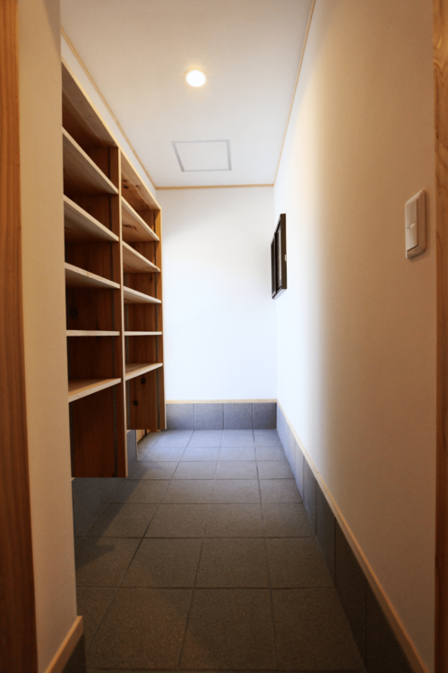 玄関の外の話になりますが、玄関前に屋根のある広めのポーチ をつくると、雨の日がとても便利に。宅配の置き配スペースにも最適です。