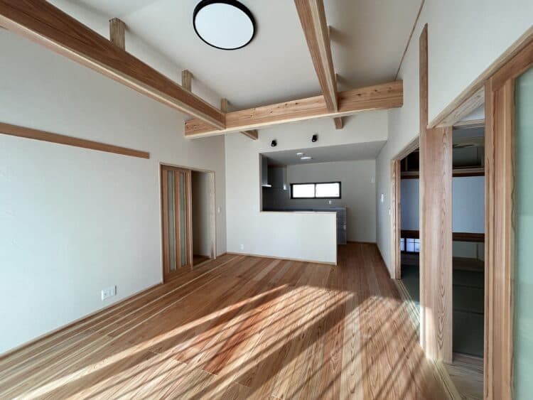 施工事例:化粧梁がアクセント♪勾配天井で明るく開放感たっぷりなリビングの家